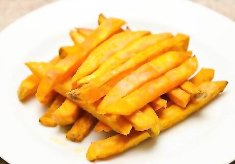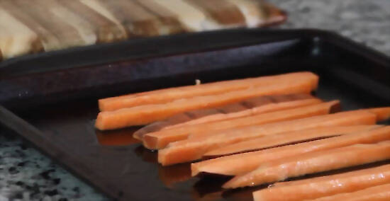 Wash and cut the sweet potatoes. Scrub 2 pounds of sweet potatoes and peel them. Carefully cut the sweet potatoes into 1/4 to 1/2 inch sticks. They should be about 3 inches long, depending on the size of the sweet potatoes. To make it easier to cut the sweet potatoes, trim the ends and immediately cut the sweet potatoes in half. This way, they will sit level on the cutting board.