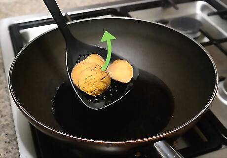 Fry the sweet potatoes in batches. Carefully place a single handful of the sweet potato chips into the hot oil. They should fry quickly and begin to turn brown and curly. Avoid letting the sweet potatoes fry for more than one minute. Avoid frying more than a handful of sweet potatoes at a time. If you add more, the temperature of the oil will drop quickly, so they won't fry properly.