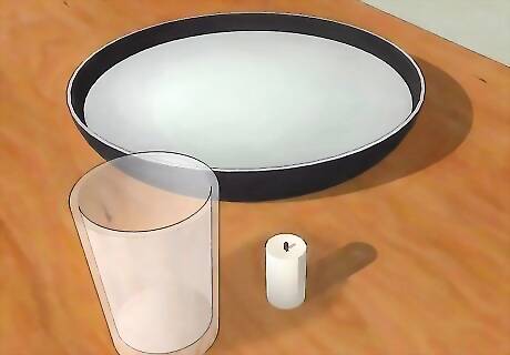 Collect all other materials needed. Make sure that you have a glass, a candle, and a lighter or match before starting. It does not matter what kind of match or lighter that you use. You must use a glass and not a plastic cup. Using a short candle also keeps the flame from directly touching the glass, however, the candle should be tall enough that the wick won’t get wet when you put it in the pan of water. If you try to substitute a glass with a plastic cup, it will melt and the experiment will fail. Tea light candles work well for this experiment.