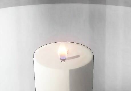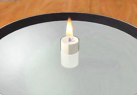 Put the candle into the pan of water. Make sure not to get the wick wet. Light the candle in the center of the pan of water. If you are using a tea light candle, it will sit in the pan on its own. If you are using a tall slender candle, it may tip over. To avoid this, use a short candle holder to stabilize the candle.
