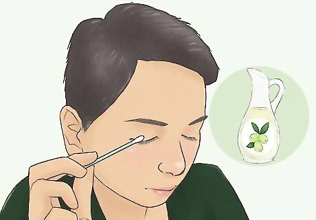 Massage your eyelids. After you take your makeup off, put a warm washcloth over your eyelids for 1 to 2 minutes. Wash your hands and dab 1 to 2 drops of olive oil onto your fingertips. Gently massage your eyelids for 3 to 5 minutes, then wipe off the oil before washing your hands again.