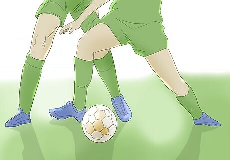 Practice shielding. Shielding is defending the ball from other players by protecting the top and sides of the ball. Roll the ball over horizontally with your foot as you move from side to side. Use four cones – try this with the cones spaced about ten feet apart in a square formation, and also with them spaced out on a larger scale. This way you can practice shielding backwards, to the left, frontwards, and to the right. Incorporate shielding and stopping. Practice various methods of defending, for example triangling.