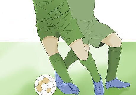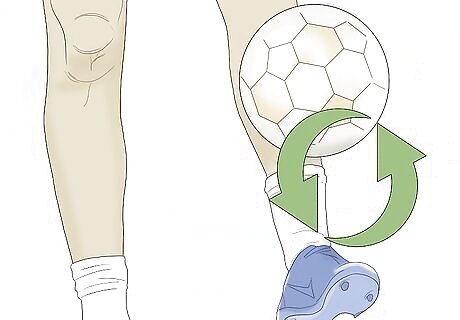 Juggle the ball. Use both feet. Kick the bottom of the ball back and forth from foot to foot, using the top of your foot. Keep your feet loose. Also try using your knees, chest and head occasionally.