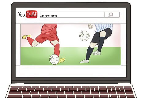 Get inspiration from the pros. You can find lots of videos on YouTube of soccer professionals giving tips, explaining drills, and demonstrating moves. If there’s a professional soccer player you particularly admire, you can specify them in your web searches as well. Pair keywords like “tips,” “skills,” “tricks” and “improve” with the category of skill you’d like tips in. For example, to find dribbling-related videos, enter “dribbling tips” into the search box on YouTube. For instance, you may want to search for the name Cristiano Ronaldo or David Beckham, and add the word “tips.” You can enter this in a regular search engine or one with specifically video results, such as Google Videos.