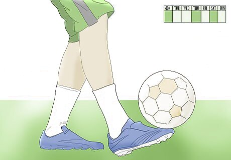 Practice at least three times a week. Do ball work for about 15-30 minutes per session. Each session should involve dribbling, juggling, controlled kicking of the ball into the air, and striking the ball against the wall. There are many other common drills you can mix into your routines as well. You can find lists of soccer drills online that target specific skills, for example shooting drills or defending drills. Go to a search engine and type in “soccer practice drills.” You can further narrow down lists by age group or skill level.