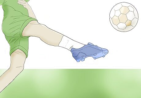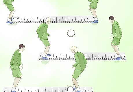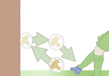 Strike the ball against the wall. This not only helps you kick, it also gives you practice at control when the ball rebounds. Try hitting low and high targets. Practice making a second shot, as well as spinning before driving the subsequent strike at the wall. Try striking the ball continually while alternating feet. Practice adjusting the angle of your approach prior to shooting.