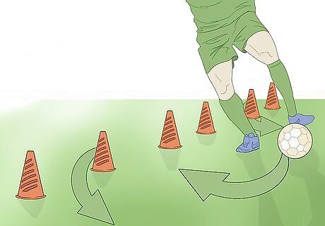 Practice dribbling. A good way to practice dribbling is the cone weave, or “cone drill.” Arrange a line of ten to fifteen cones approximately a foot and a half apart. Dribble the ball in between the cones with controlled touches as tight as possible (about a couple of inches each). Dribble the ball in between the cones in a zig-zag pattern. Try to use three touches with the inside of the foot, then three touches with the outside of your foot, and repeat. Examples of other dribbling drills are close space drills, The George Best Game, and lane dribbling.