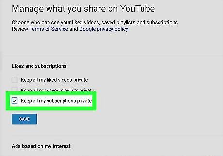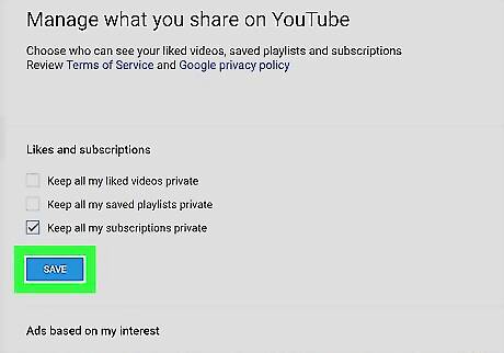Click the blue SAVE button. This will save your new privacy preferences, and make all your subscriptions private on this account. You'll see a message saying "Your changes were saved" on a blue bar at the top of the page.