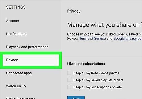 Click and check the box next to "Keep all my subscriptions private." You can find it under the "Likes and subscriptions" heading on the Privacy page. When this option is checked, all your artist and channel subscriptions will be made private on both YouTube and YouTube Music.