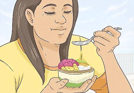 Enjoy your new food experiences in a meditative way. When travelling, you'll often come across new foods that you haven't tried before, or variations on foods you are used to. Not only does this offer a wonderful opportunity to open your mind to new experiences, tastes, and sensations, but there is a meditative opportunity here too. Pay attention to each and every ingredient of a dish. Can you name the particular ingredients? Eat slowly to enjoy the experience of eating – this will aid your digestion and help with peace of mind. Chew and swallow your food slowly. Before swallowing, make the food almost liquid. Swallow the food mindfully. Experience the different tastes from the food and drink. Use snacks as an entire meditation experience. For example, take a single raisin, or a slice of an orange, and turn it into an eating meditation. Become totally aware of the entire process of chewing it, feeling it on your teeth, tasting it on your taste buds, and swallowing it.