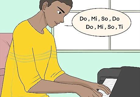 Sing the names of the notes to reinforce your memorization. Singing the names of the notes in the right pitch reinforces your aural memory – your memory for sounds. Because you're singing the names of the notes, it also reinforces your memory of the notes that are played in the piece. Try doing this with each hand's part separately. Otherwise, you'll be trying to sing the names of several notes at once.Tip: As long as you have relatively good voice pitch, you can sing the names of the notes virtually anywhere to reinforce your memory, such as during your morning commute to work or school or while doing chores at home.
