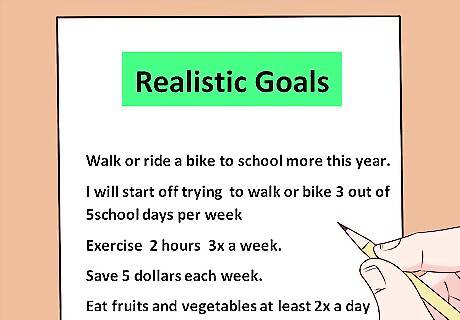 Set realistic goals. Recognize real limitations, without being defeated by them. Set small manageable goals that will boost your mood gradually as you achieve them. Setting unrealistic goals will only set you up for failure. Break large goals up into smaller goals to achieve as you progress towards the greater goal. This will minimize the devastating effects of failure and set back. If you decide to set a goal to lose at least 50 pounds in a year, break it into smaller weekly goals. Working towards losing 1 pound a week feels more attainable, and failure to meet that goal feels less significant than focusing on the total of 50 pounds.