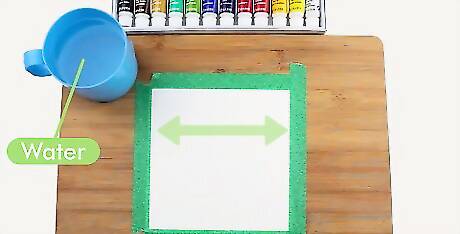 Stretch your watercolor paper. When painting watercolor washes, you need to prepare the paper. Soak a sheet of watercolor paper in cold water for 2 minutes. Remove the paper from the water and place it on a flat drawing board. Smooth the paper out with a sponge. Watercolor wash techniques won't work if the paper is too wet. Tape the paper around all the edges firmly to the board, and let it dry. EXPERT TIP Kelly Medford Kelly Medford Professional Painter Kelly Medford is an American painter based in Rome, Italy. She studied classical painting, drawing and printmaking both in the U.S. and in Italy. She works primarily en plein air on the streets of Rome, and also travels for private international collectors on commission. She founded Sketching Rome Tours in 2012 where she teaches sketchbook journaling to visitors of Rome. Kelly is a graduate of the Florence Academy of Art. Kelly Medford Kelly Medford Professional Painter Expert Trick: Wet the paper for softer colors and edges in your painting. Spray some water on your paper or rub it with a moist paper towel. This technique makes all the colors and edges softer. Plus, it's super helpful for correcting while you paint, which you'll probably be doing as a beginner!