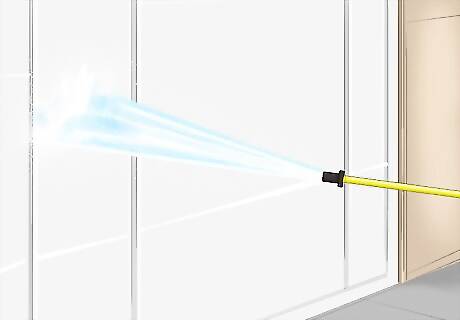 Pressure wash your garage door. Let dry. Use denatured alcohol soaked in an a clean rag or wiping cloth to remove grime that have accumulated over a period of time on the garage door surface. Lightly sand the door surface with a fine sandpaper for better paint adhesion.