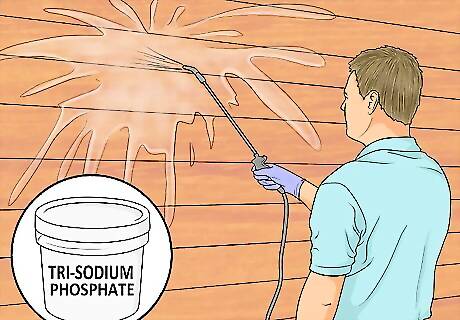 Wash the wood with a weak solution of tri-sodium phosphate (TSP), if it is allowed in your state. Check into the health regulations regarding this toxic material. Rinse well with water and allow the redwood to dry. Use eye-protection, gloves, long-sleeved shirts and pants when working with TSP. Make sure no animals or children get near it. Dispose of excess TSP at a toxic waste disposal site. Do not allow your newly stripped redwood sit long without staining. Because it is soft, it can easily absorb moisture and dirt.