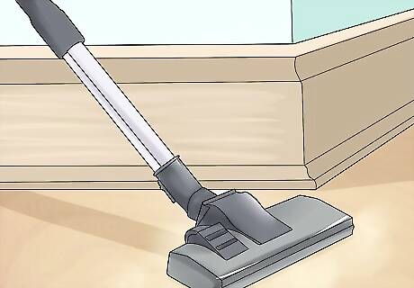 Vacuum up the dust from the skirting boards and your workspace. Sanding generates a lot of dust, so do your best to clear it all out before starting to paint. Vacuum the floor or carpet around where you were sanding. Be particularly mindful of the little crack between the skirting boards and the floor, as this is a notorious dust hiding place. Use a thinner hose or brush attachment for your vacuum if you have one.