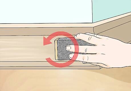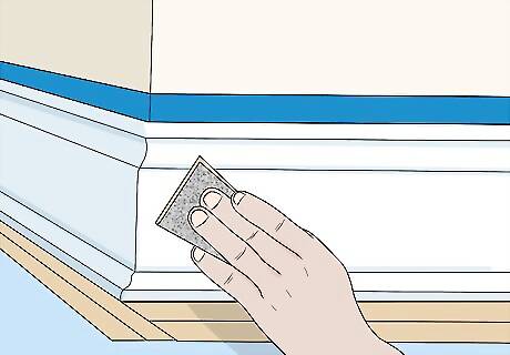 Sand the skirting boards with fine 180-grit sandpaper. This step is especially important if you are working with skirting boards that were previously painted with glossy paint. Rub fine sandpaper (180-grit) wrapped around a wood block in small circles on the skirting boards to create a rougher surface on the skirting boards that the paint will stick to. You don’t have to entirely remove the paint that was there before, but sand enough so that the shine on the board disappears. Turn to 80- to 120-grit sandpaper if you want to get rid of bumps or imperfections (i.e. large globs of old paint). Sandpaper sponges also work great, especially for sanding surfaces (like skirting boards) that aren’t completely flat.