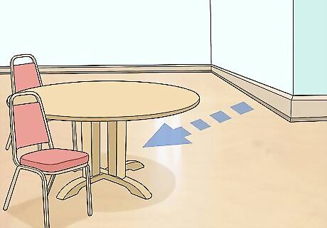 Clear all furniture out of the way. Move all of the furniture in the room to another room, or at least out of the way from the immediate area where you will be painting. It’s not necessary to cover furniture, but just make sure it is at least ⁄3 to 1 m (2.2 to 3.3 ft) away.
