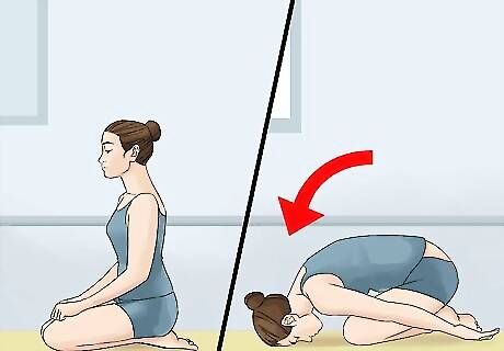Begin the position in child’s pose. Lower down on to your knees on the mat. Sit back onto your feet. Lean forward until your forehead is resting comfortably on the ground. Your chest should be resting on your thighs. Allow arms to lie limp at your sides with palms facing up.