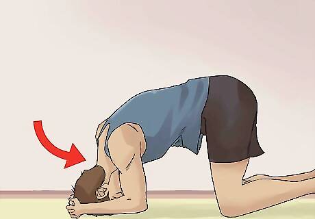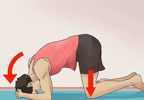 Lift your hips up and forward so your head lands into the palm of your hands. Knees stay on the ground.