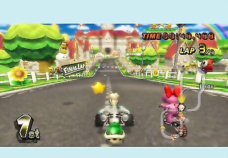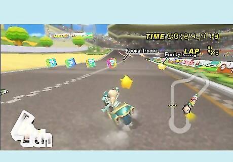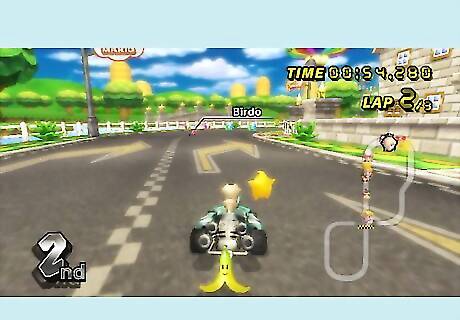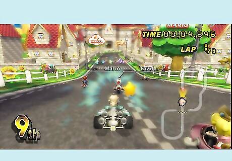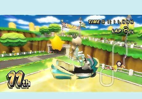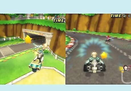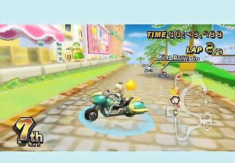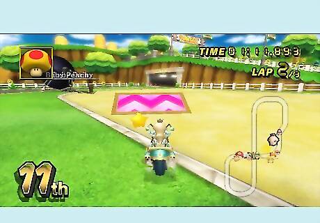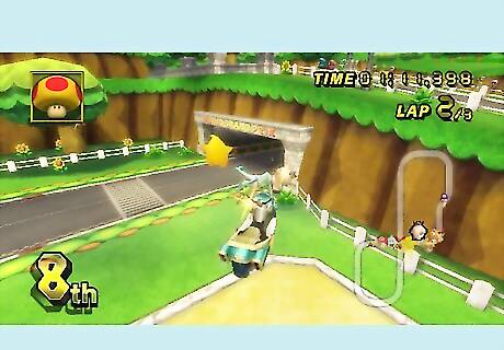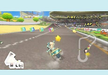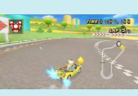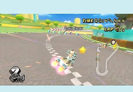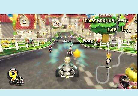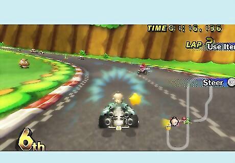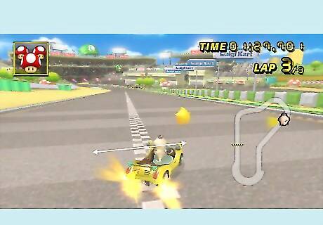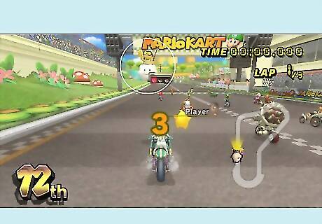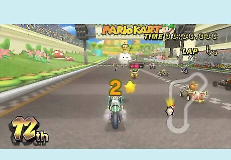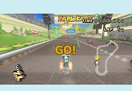 This technique allows you to be in the lead right before the timer goes off! When doing this trick, you can charge up your gas and hold it off until the race begins. This way, you can get an early boost in the race without even drifting, snaking, or moving at all, and get ahead of those behind and ahead of you at the starting line. From Mario Kart Wii and onwards, start holding the acceleration button about 2 seconds before the race starts. Too late, and nothing happens; too early, and you'll burn out!