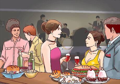 Consider serving light refreshments instead of a full meal. Not all weddings have full sit-down dinners, and you should not feel obligated to serve a meal to your guests. Serving hors d'oeuvres and drinks is another way to cut down on costs. Or a dessert bar.