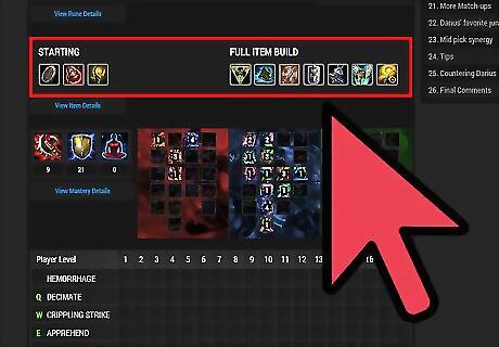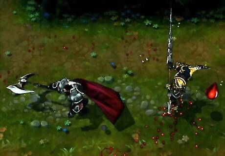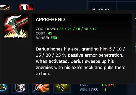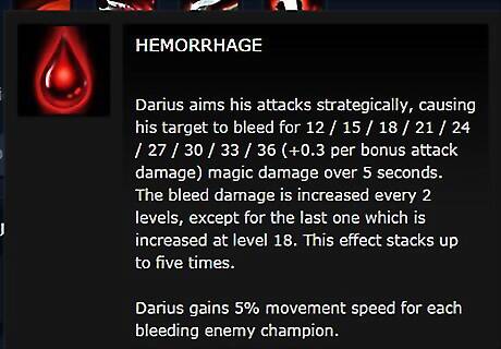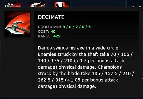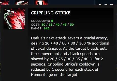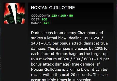 Mid game. Once you have your ultimate, look to really dominate your lane by getting the enemy to around mid-health (this is somewhat dependent on your opposing top laner. If they're quite tanky, keep poking until they're below half health.) and then committing to a kill attempt.Play Darius in League of Legends Step 7.jpg When you commit to the kill, land your Q and some basic attacks to add Hemorrhage before using Crippling Strike to slow them down, continue auto-attacking and Decimate, save Apprehend until they start escaping and then use Noxian Guillotine to finish them off.