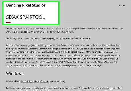 Launch the SixaxisPairTool on a computer. Head to Dancing Pixel Studios (developer of Sixaxis), and click the download link in the page that corresponds to the operating system of the computer you are using. Install the software after you finish downloading the installer, and launch the SixaxisPairTool by clicking on its icon in the desktop. The pair tool is free to download and install.