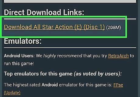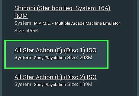 Select the game from the results. The search may yield multiple results, so you need to identify the right one to download. Scroll down the page, and tap the game title that matches the one for your system. Generally, the system (in this case, Sony PlayStation) should be stated below the game title. After tapping the game title, you should be taken to the file download page on the site.