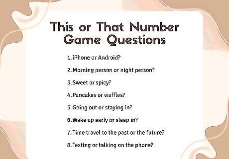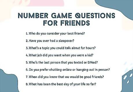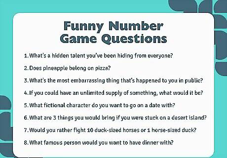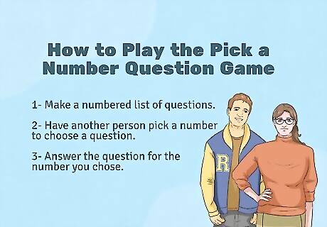 Have another person pick a number to choose a question. When you’re ready to start, ask a player to choose a number randomly. Look through your list for the number and read the matching question out loud for everyone to hear. The number question game works for any number of players, but it’s perfect for a one-on-one game to learn more about another person. Alternatively, you could post the question list on your social media and ask other people to put a number in the comments for you to answer.