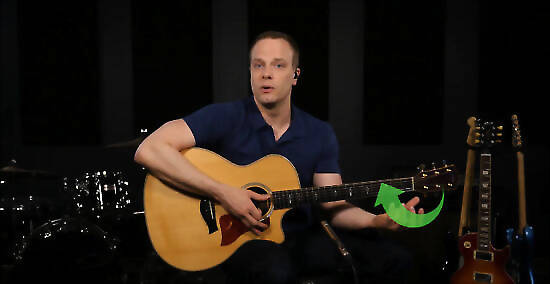 Use the guitar frets to tell you where to put your fingers. The frets are your key navigation tool on the guitar, and they correspond to different notes on each string. They are the little metal strips on the long, thin neck of the guitar. The first fret is the one farthest away from the body of your guitar. To play a note on the first fret, you put your finger down between the first fret and the head of the guitar. If you're not holding a fret down on a string, then you are playing an open string. You always play behind the fret -- if the song wants a note on the "10th fret," you'd put your finger between the 9th and 10th frets on the guitar, as close to the 10th as possible.