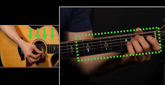 Practice your two chords by strumming, removing your hand, then reforming the chord. Learning chords is not easy at first, and changing chords can be the hardest thing newbies have to do. To make life easier, make sure you have each chord memorized and down pat -- you should be able to quickly form them as soon as your hand touches the guitar. Simply form the chord, strum, remove your hand, and repeat. Remember, however, that playing a chord quickly is useless if it sound buzzy or muted -- focus first on quality over quickness. Think about how a chord feels, not just how it looks. Can your fingers find the chord without your eyes?
