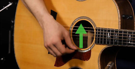 Practice brushing the pick over the strings in each direction to start strumming. Once you have the basic motions down, work on hitting all six strings with relaxed, calm down strokes, counting each one out ("1 and, 2 and, 3 and, 4 and, 1...") to stay in rhythm. Then try some simple upwards strums, noticing how they feel a little different. Most guitarists notice that need less strumming strength and can skip the top 2-3 strings to get a good sound strumming upwards. Strumming should feel easy, gliding over the strings. If you're having difficulty, try to dig the pick less into the strings, just brushing it over the strings instead.