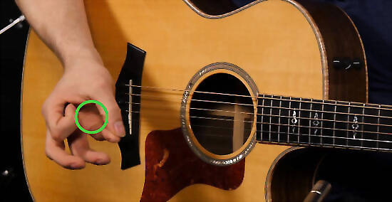 Start with a pick for easier beginner strumming. Because they are thinner and made of hard plastics, picks are much easier to strum with early on, though there is no real "right" way to learn. Make an "O" shape with your fingers by placing the pad of your thumb on top of the side of your index finger. Slide the pick in between to hold it with firm, comfortable control. If you're having trouble holding onto the pick, try using your middle finger as well for stability. Most people start with a medium, pointed pick, something around .7mm in thickness. Again, however, your comfort playing is more important than any "right" choice of picking device. Some people would rather use their fingers, after all.