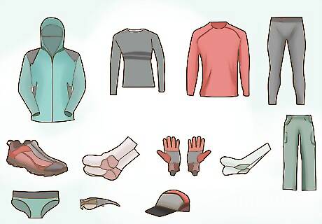 Assemble your clothing. The best principle for packing clothing that will keep you warm and comfortable is layering. Having clothing that you can layer will keep you warm or cool and dry. Avoid cotton items, which don’t wick moisture. Instead, try synthetic or merino wool materials. The following clothing items can help keep you comfy as you journey along the Appalachian Trail: Base layer to wick moisture from your body or insulate you even when it’s wet outside Middle layer like a fleece or down jacket/ sweater; sometimes called the “soft shell” Third layer that is weather and windproof; often called the “hard shell” Hat Gloves Hiking pants or shorts; legs that zip off are an excellent option Underwear Hiking socks and sock liners to prevent blisters Hiking boots