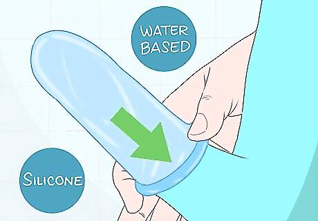 Put on a condom correctly when the penis is erect. To put one on, place it on the end of an erect penis with the tip pointed out. Use your fingers to gently pinch the tip to force out the air. Roll the condom down the penis until it reaches the base. Don't use oil-based lubes, such as baby oil, cooking oil, lotion, or petroleum jelly, with latex condoms. Only use silicone- or water-based lubes, which you can find at most drug stores and big box stores.