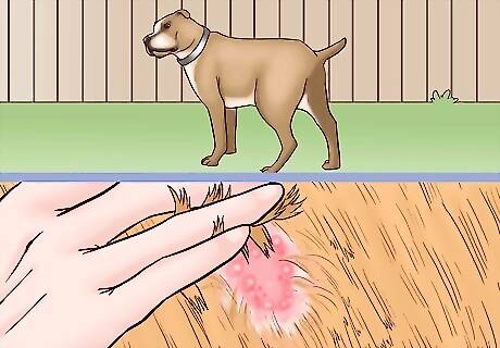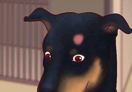 Look for red, circular lesions on the dog’s skin. Ringworm infections occur most commonly on dogs’ heads, ears, tails, and front paws. However, any part of the animal’s body can be infected by ringworm. If you catch a ringworm infection early, it will appear pinkish in color. You’ll likely notice scaly skin pieces around the area and across the dog’s body. You might need to push apart the dog’s thick hair to see the skin underneath. A well-established infection will show round, slightly raised, rash-like lesions, and the skin covering the lesion and look scaly and grey.