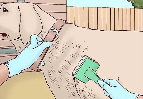Clean out the dog’s hair from its brush and dispose of the hair. Ringworm fungi tend to stick to dogs’ hairs, and when you brush the dog, the fungi cells stay on the brushed-out hairs on the brush. Pull all of the animal’s residual hair out of the brush daily. Throw the hair away in a trashcan with a lid, so the dog won’t accidentally come into contact with it. If you’re concerned that your dog may already have a case of ringworm, wear a pair of gloves when you pull the hair out of the brush. A vet might suggest you cut a long-haired dog’s coat to reduce the amount of contaminated hair and help medicinal shampoo work better.