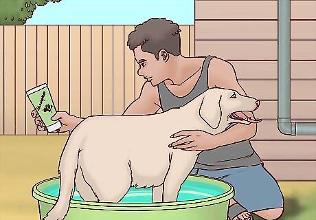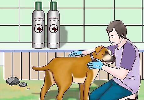 Wash your dog with a medicated shampoo if it has ringworm. Despite your best efforts at prevention, your dog may end up with ringworm. In this case, the first thing to do is to visit your veterinarian. They’ll prescribe your dog a medicated antifungal shampoo. Wash the dog with the shampoo once daily (or as directed on the packaging) for 2–3 weeks. Make sure to wear plastic gloves while you’re washing the dog so you don’t catch the ringworm! If a medicated shampoo won’t work for your dog for some reason, the vet may prescribe an antifungal medicated cream or a pill to give the dog orally.
