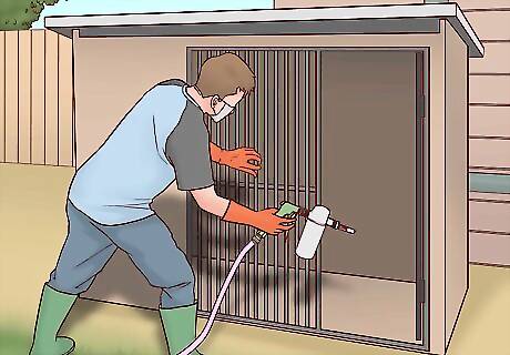 Disinfect the dog’s kennel if you suspect it’s infected. In some cases (e.g., if you’re boarding the dog while you travel), your dog may use a kennel that another dog has recently stayed in. In this situation, disinfect the crate or kennel to prevent your dog from catching ringworm. Try mixing together bleach and water at a 1:10 ratio in a plastic spray bottle. Spray the bleach mixture across the interior of the kennel, and wipe it clean with an old rag or a handful of paper towels. Be careful about the type of disinfectant you use, as some do not kill the fungal spores. Ones that do work include benzalkonium chloride, diluted bleach, and strong detergents.