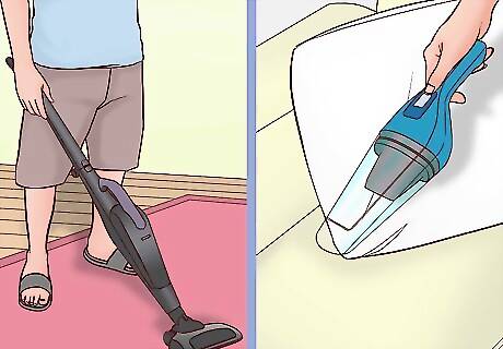 Clean areas of your home that the dog sleeps and spends time in. Fungi spores can easily fall off of your dog and remain dormant in a rug, carpet, or sofa. If your home isn’t cleaned, the dog can get re-infected by brushing up against ringworm fungi. So, regularly clean all carpets, rugs, fabric-covered furniture, and drapery that your dog often comes into contact with. Also wash the dog’s bedding on a weekly basis. Use hot water if possible, and line dry in direct sunshine or a hot setting of the dryer. Vacuum all areas likely to be affected by a ringworm infection daily, both during and after an infection, and as a precautionary measure. Dispose of the vacuumed contents in the outside trash can, in an enclosed bag. Keep your dog in one room of your home so it’s easier to clean and decontaminate. Also keep the dog’s food and water bowls clean. If possible, wash them with soapy water at the end of each day.