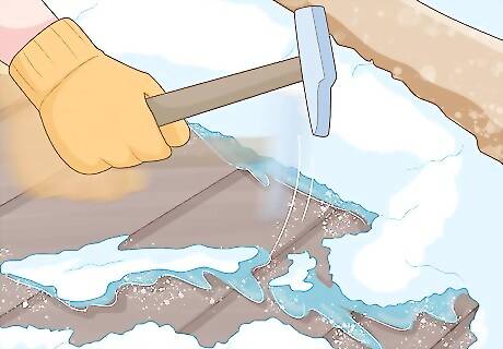 Chip at the ice with a mallet after it has begun to melt. Use a rubber mallet to limit your chances of damaging the roof. As the ice around the edges of the eaves begin to melt, climb up on a ladder and start hammering. Widen any drainage channels you see in order to draw moisture off the roof at a faster rate. This works best on warmer days when the ice begins to soften. Make a channel in the ice first by using an ice melter or warm water. Once the ice softens, it’s much easier to chip away. Never use sharp tools like ice picks or hatchets on the ice, since you will most likely puncture the shingles underneath it. Be very careful when working to avoid hitting the roof. Removing the ice this way can be very dangerous if you’re not careful. You could trigger the entire sheet of ice. To prevent it from falling, work on a warm day and chisel away at the edges of a melted channel.