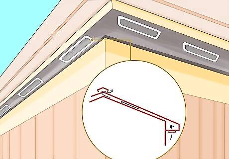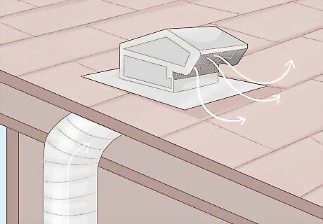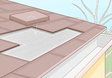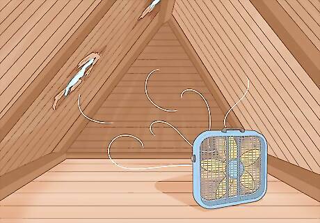 Make vents along the roof’s eaves to let out hot air. Soffit vents fit underneath the hanging edges of a roof. To install a soffit vent, cut away part of the wood underneath the horizontal edge of the roof. Then, fit an 8 in × 16 in (20 cm × 41 cm) metal ventilation plate over the hole and screw it in place. Add more vents as needed to improve the air flow inside your home. You need approximately 1 sq ft (0.093 m) of vent space for every 300 sq ft (28 m) of floor space in your attic. If you’re unwilling to risk installing vents yourself, contact a roofing professional.