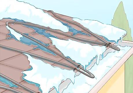 Clip a snow melting system to your roof to resist ice formation. Snow melting systems take the form of heated wires that clip to shingles and the edge of your roof. Run the heating elements back and forth in a zigzag above the gutters. Then, plug the system into a nearby outlet to melt away the snow. You will need to run the wire through downspouts attached to the roof so the water doesn’t freeze as it runs off the roof. Wait for a clear, dry day to install the wires. Don’t risk going up on the roof while it’s slippery. Wear a harness to guard against falls.