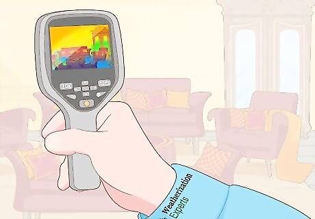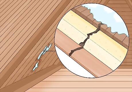 Check for leaks underneath roof shingles and insulation. Start by climbing into the top room of your home and pulling away the insulation. Look for those telltale water marks as well as any spots that feel cold or wet to the touch. When the weather gets warmer, head up onto the roof and check for gaps in the roofing and waterproofing. Keep in mind that warm air leaking up through an attic floor can also contribute to ice build up. Track water stains higher up along the roof if you’re uncertain of where a stain originates. Expect moisture to run downhill along the slope of the roof. Another way to find damaged spots is to shine a light up through the roof. Look for the light to shine through small holes in the insulation. The insulation around these spots may also turn black over time. Make sure the insulation is even all across your attic, as well—if it's thinner in some spots, heat could be causing the ice to melt.