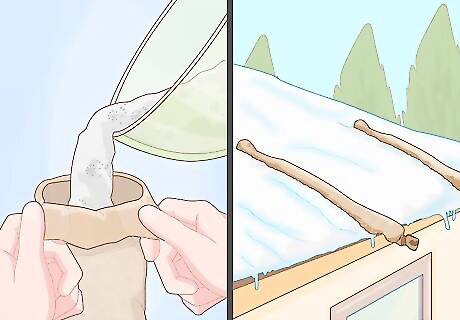 Use a box fan to blow cold air at any leaky spots in the roof. Drips coming in through the roof are scary, but they can be stopped temporarily. Climb up to the attic or top room of your house and try to find the source of the leak. Then, plug a box fan into the nearest outlet. It needs to be adjustable so you can position it to point directly at the leak. Note where the leaks are so you can look for them after the weather warms up. Dripping water or water stains make them recognizable. They will often be behind ice dams on the roof. The cold air helps freeze the melting ice back up. It’s a temporary solution, but it gives you some time to regroup until you can call a roofer or get on the roof on a warmer day.
