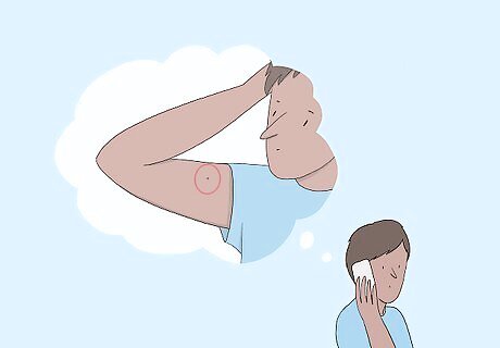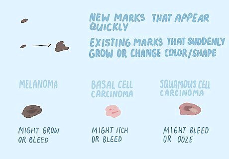 Any new marks that appear quickly are suspicious. Also existing marks that suddenly grow or change color or shape are a cause for concern. Besides these signs, each type of skin cancer presents differently, so be on the look out for these symptoms. Melanoma specifically presents as a dark brown or black spot with a poorly-defined border. The spot is usually larger than ⁄4 in (0.64 cm) in diameter. It might grow over time or bleed occasionally. Basal cell carcinoma looks like a flesh-colored scar with some raised, red patches. These patches might itch or bleed, possibly turning into sores. Squamous cell carcinoma looks like a rough, red, scaly bump on the skin. The patch might cave in at the center or develop wart-like growths around it. These patches sometimes bleed or ooze.