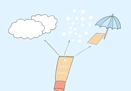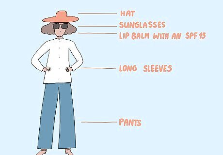 Cover all your exposed skin with long sleeves and pants when you're in the sun. A hat can protect your head, eyes, and neck from the sun. Also wear sunglasses to prevent damage to your eyes, and use lip balms and makeup with an SPF 15 rating. If it’s hot, try wearing lightweight material that won’t overheat you. Remember to apply sunscreen to the areas that are still exposed, like the back of your neck.