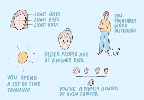Anyone can get skin cancer, but some people are at a higher risk. If you have very light skin, hair, and eyes, then you’re less protected from the sun and more susceptible to developing skin cancer. If you regularly work outdoors or spend a lot of time tanning, either outside or in tanning beds, then you’re also at a higher risk. Older people are at a higher risk of developing skin cancer as well because they’ve had more time to be exposed to UV rays. If you have a family history of skin cancer, you’re also at a higher risk. Take extra steps to protect yourself.