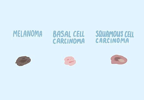 Skin cancers don’t look like normal moles or freckles. Different types of skin cancer have distinct appearances, but all look like discolored or abnormal growths on the skin. The specific type of cancer determines what it looks like. Melanoma is characterized by a dark, asymmetrical spot with a poorly-defined border. This spot might be raised or rough, and usually grows over time. Basal cell carcinoma looks like a flesh-colored scar with some raised, red patches. These patches might itch or bleed, possibly turning into sores. Squamous cell carcinoma looks like a rough, red, scaly bump on the skin. The patch might cave in at the center or develop wart-like growths around it. These patches sometimes bleed or ooze.